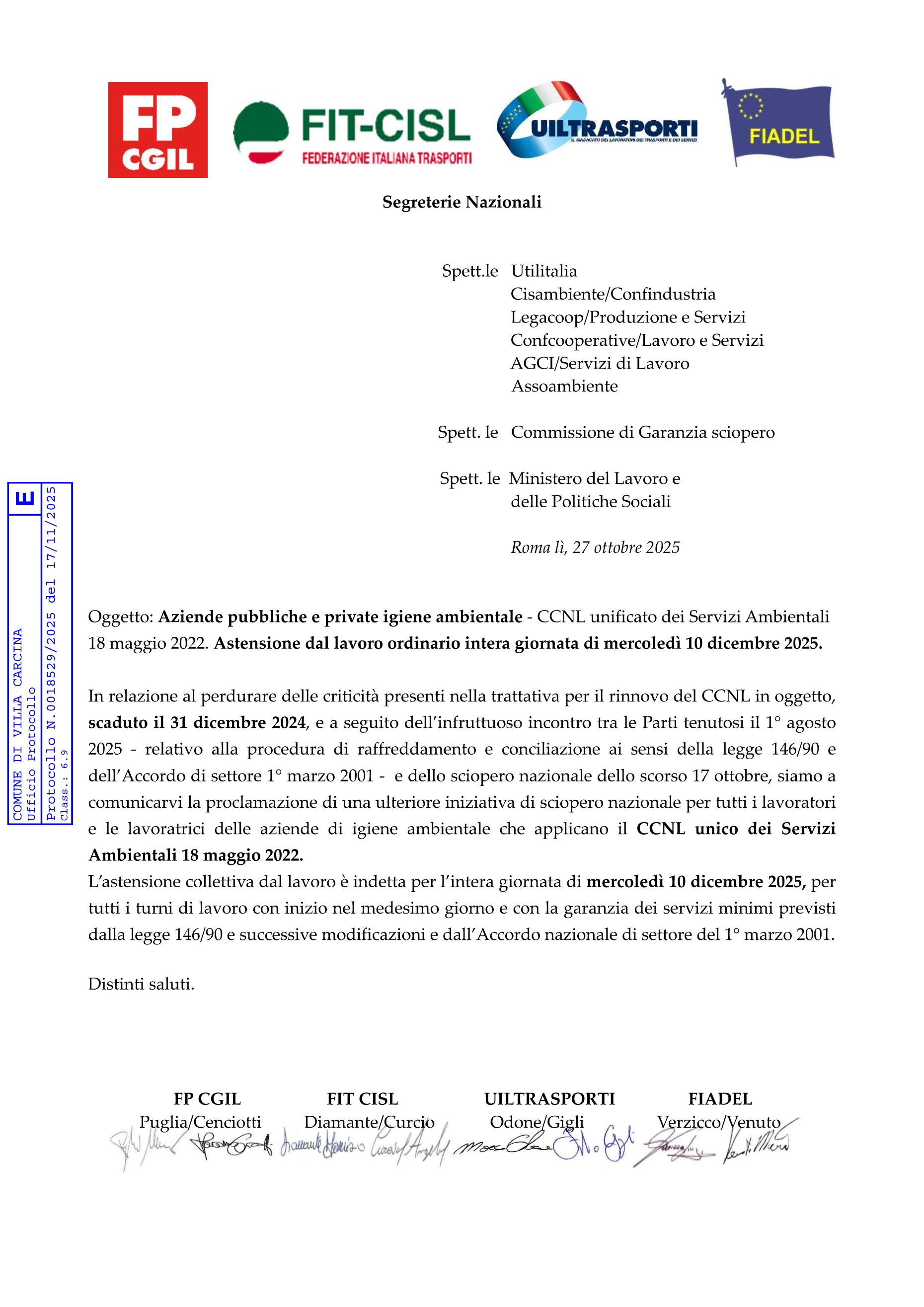 Vi informiamo che, a seguito della proclamazione da parte delle principali Organizzazioni Sindacali di categoria di uno sciopero nazionale per domani, mercoledì 10 dicembre, potrebbero verificarsi disservizi nel normale svolgimento delle attività di raccolta rifiuti, come da nota allegata.