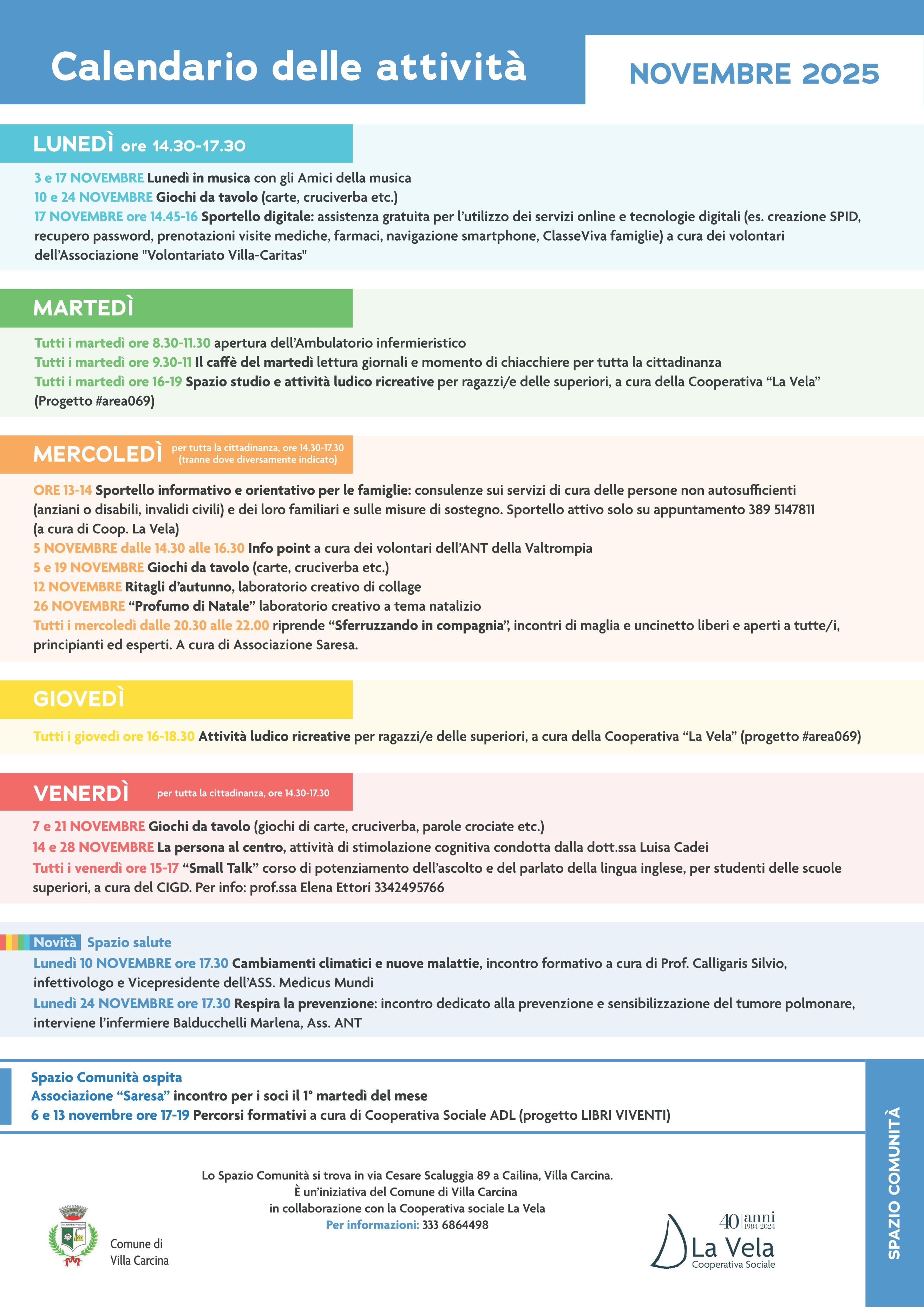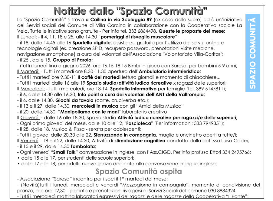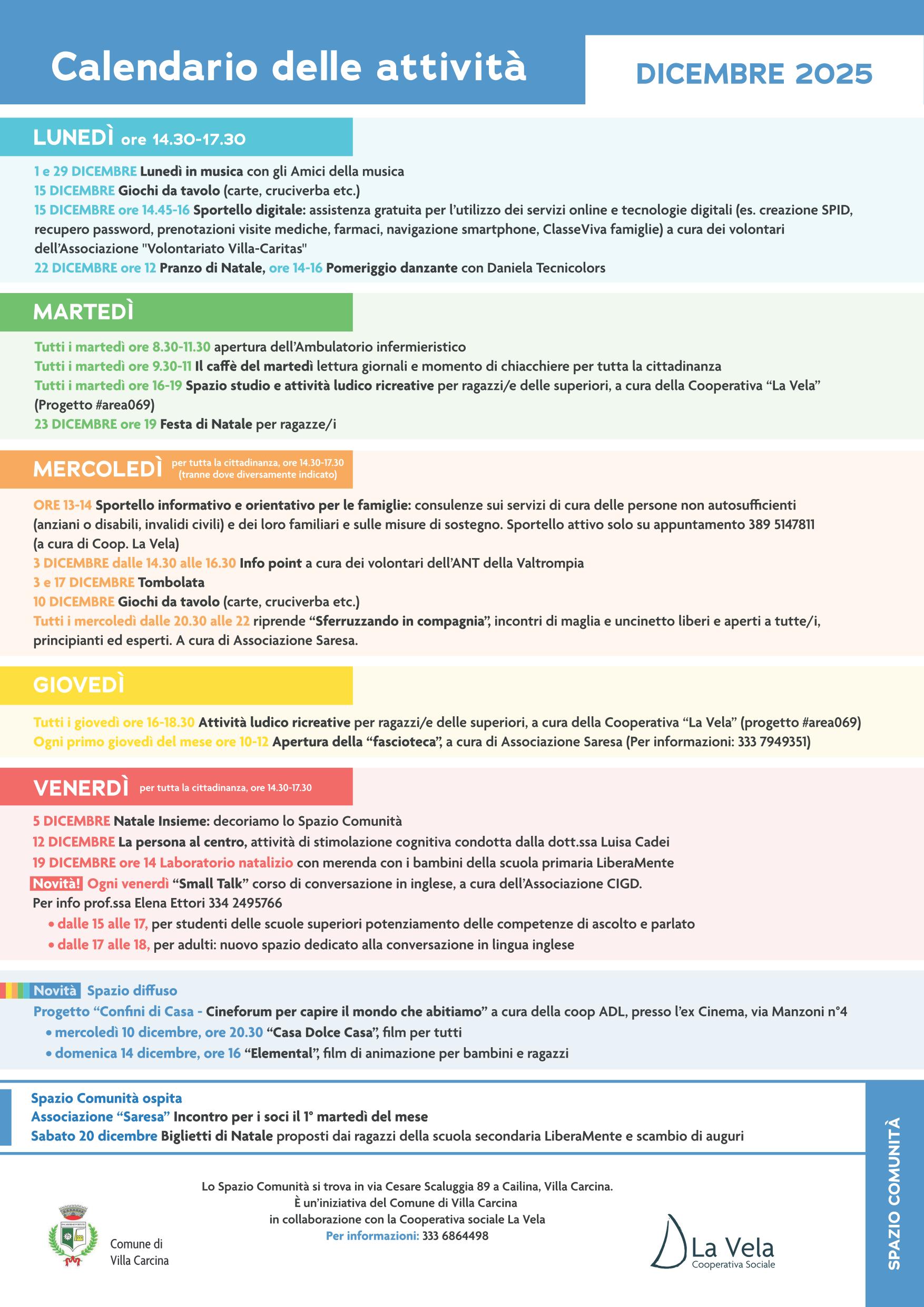 Lo Spazio Comunità è un’iniziativa dei Servizi sociali del Comune di Villa Carcina in collaborazione con la Cooperativa sociale La Vela.